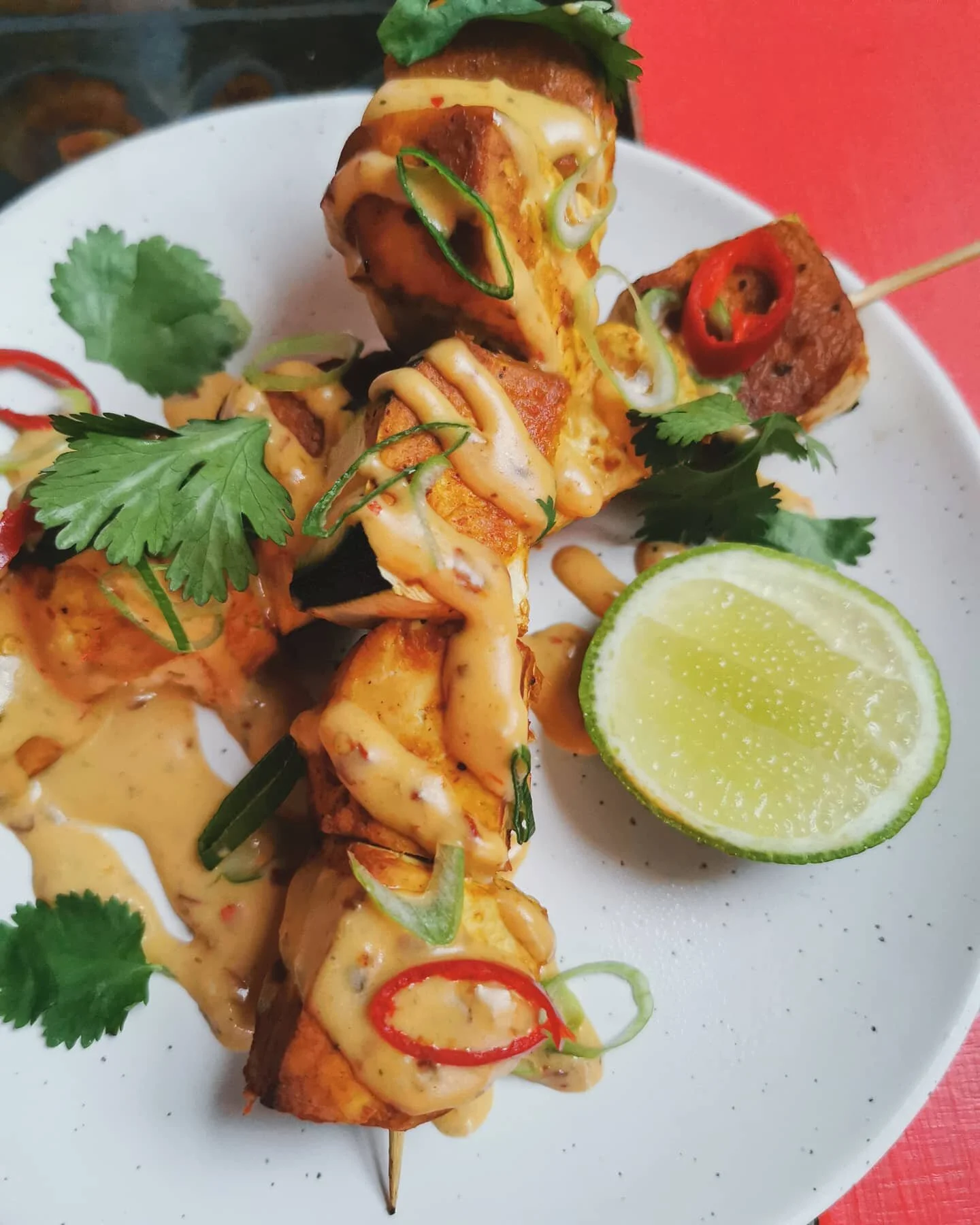 Once the skewers are done, drizzle your spicy Banana Mayo on top and sprinkle fresh herbs such as coriander or spring onions/chilli for freshness and a pop of colour! A squeeze of lime on top too is also delicious!