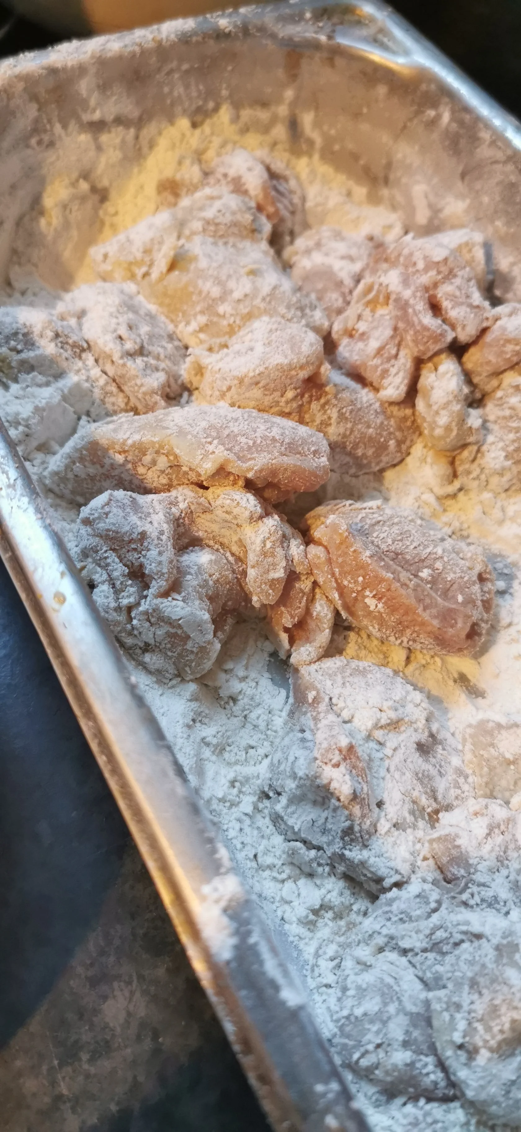1. Once your Chicken has marinated- cut your Chicken into “nugg” pieces and stick in the dry mix batter.