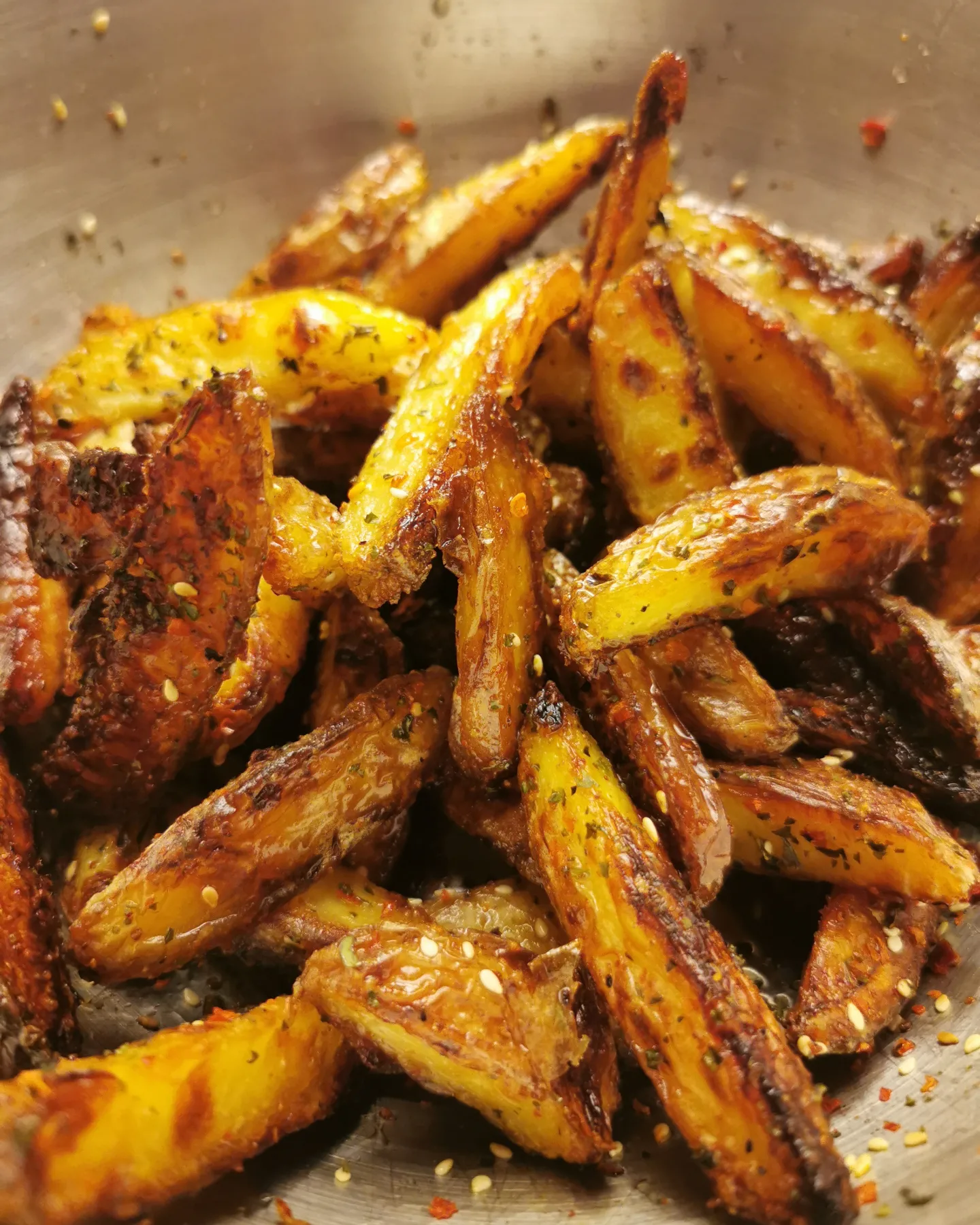 The other night was made Mob Kitchen’s Katsu chicken burger (which was unreal btw) and we had a bag of spuds that needed using up. These chips are super simple but are so tasty. I even had one of these cold the next day and they were still so crispy.